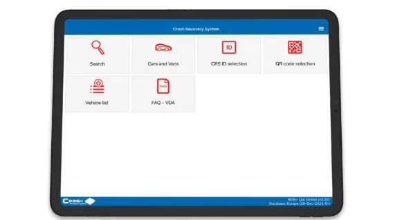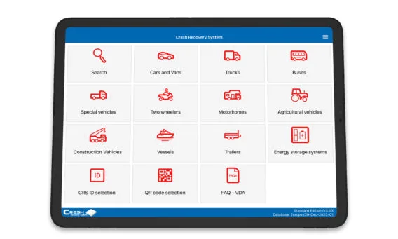 pokazuje interaktywny widok pojazdu z góry i z boku, wskazując dokładną lokalizację istotnego sprzętu ratowniczego w różnych schematach kolorystycznych. Dodatkowe informacje mogą być wyświetlane w celu wskazania, jak bezpiecznie wyłączyć te systemy podczas akcji ratunkowych. Aby wybrać pojazd w Edycji Standardowej, konieczne jest wybranie marki, modelu, nadwozia i rocznika pojazdu w samowyjaśniającym się interfejsie użytkownika CRS.