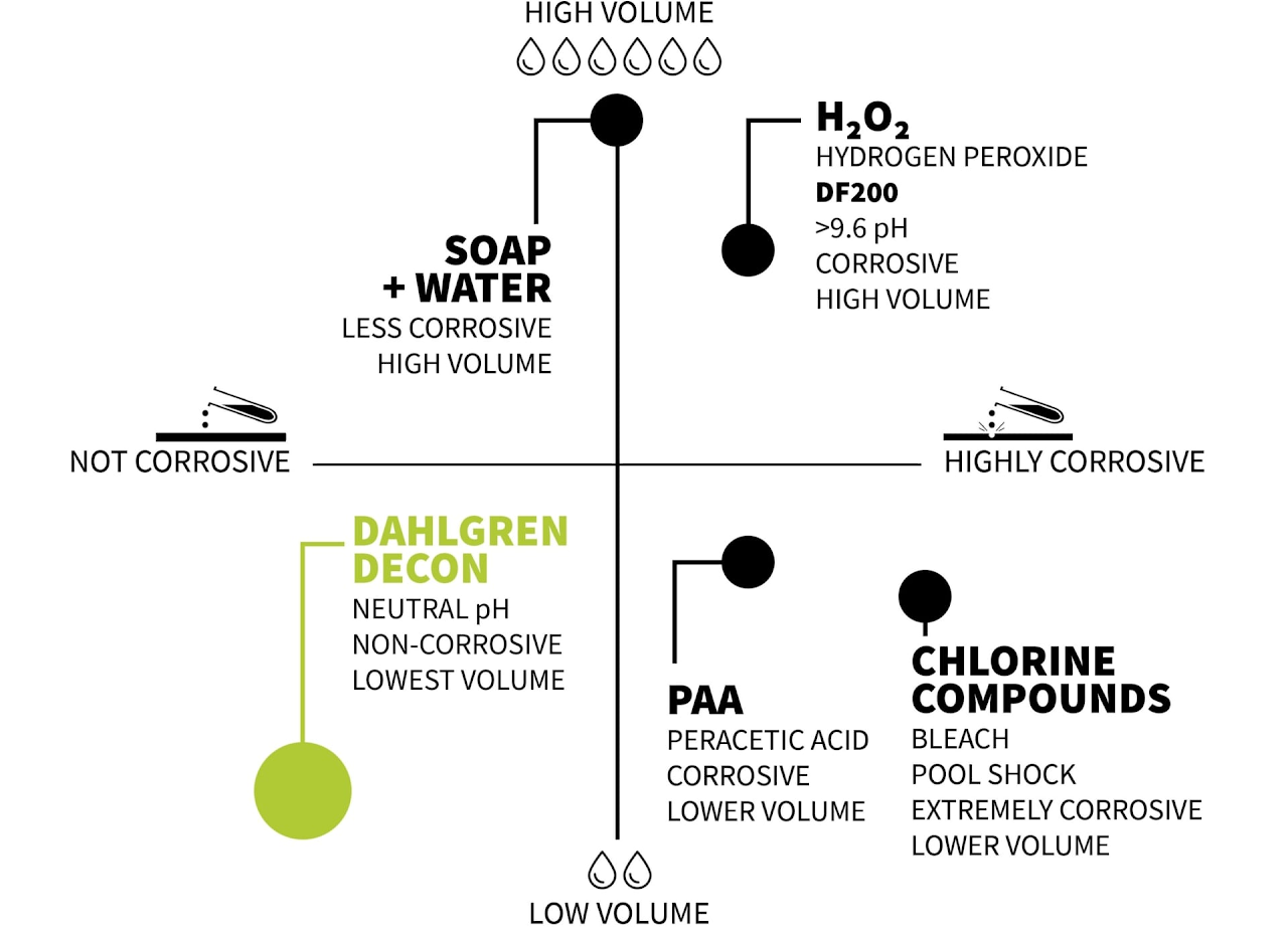 Grafika pokazuje różnice między najczęściej stosowanymi metodami dekontaminacji pod względem korozyjności i ilości wymaganego środka.